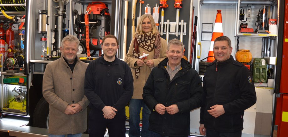 (Bild 1: Von links: Ralf Schaumlöffel-Kraft, Wehrführer Daniel Termer, Carmen Kraft, Bürgermeister Dirk Oetzel und Stadtbrandinspektor Steffen Rödel)