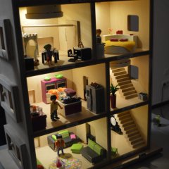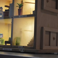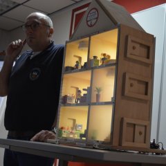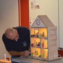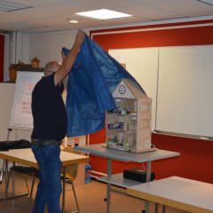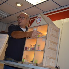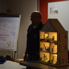 Das aus Holz gefertigte Modell mit einer Front aus Plexiglas kann über kleine Schalter verraucht werden. Es zeigt anschaulich, wie sich Rauch in einem Gebäude ausbreitet und was passiert, wenn Fenster oder Türen geöffnet werden. Auch die eingebauten Rauchmelder lassen sich gezielt auslösen und demonstrieren so ihre Funktion.